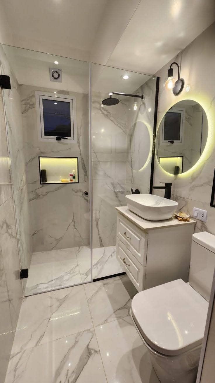 Rénovation d'une salle de bain style moderne avec vasque, receveur, robinetteries, faillance, parois vitrée et toilette.